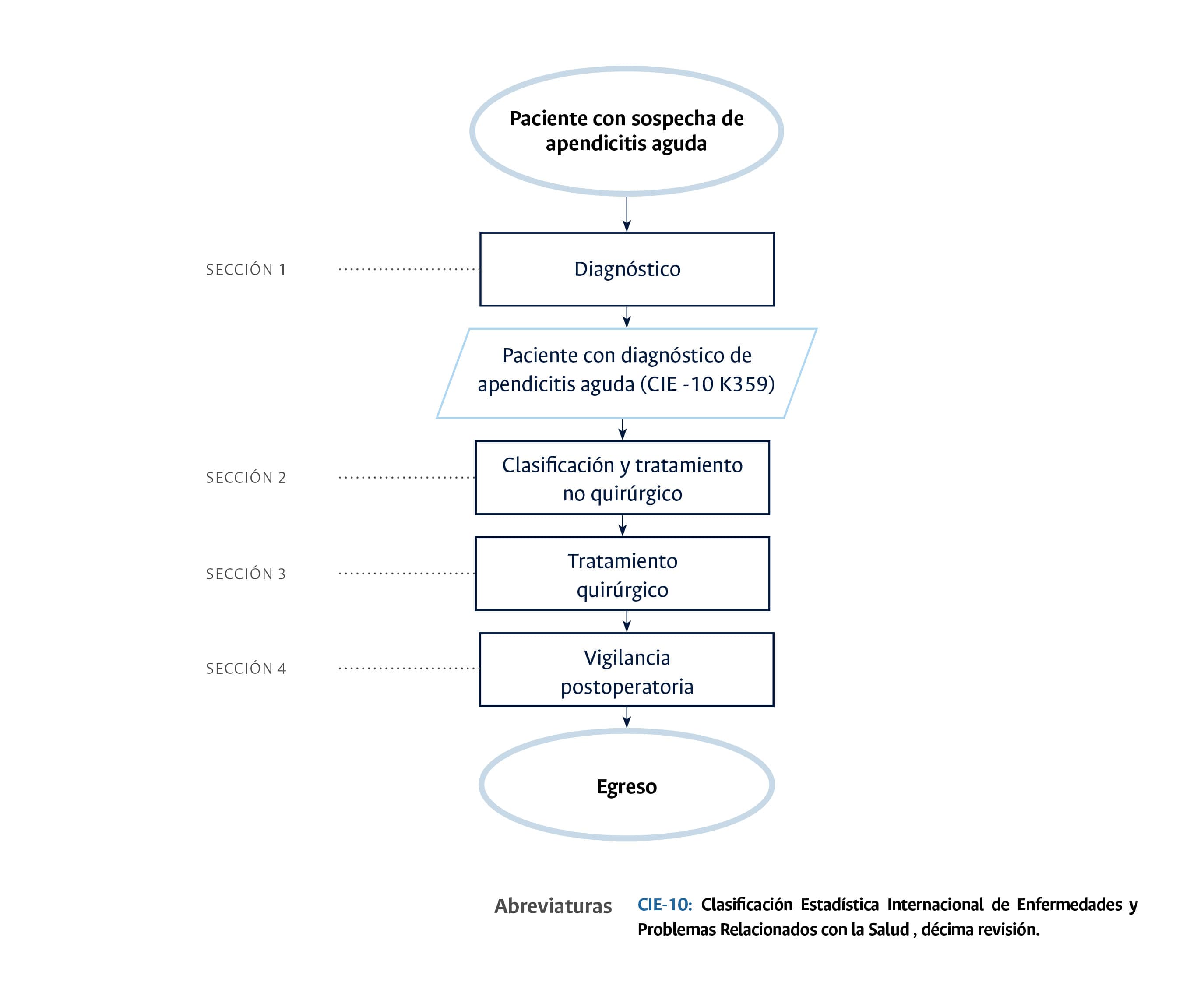 3. Tiempo de manejo quirúrgico (Sección 3: tratamiento quirúrgico): el paciente con indicación quirúrgica debe recibir el manejo en un tiempo máximo de 24 horas, y en pacientes con diagnóstico de apendicitis complicada en un tiempo máximo de 8 horas.