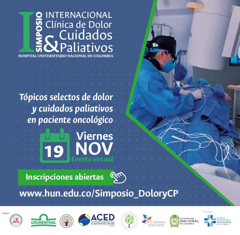 Para celebrar esta importante fecha los invitamos al PRIMER SIMPOSIO INTERNACIONAL DE CLÍNICA DE DOLOR Y CUIDADOS PALIATIVOS HOSPITAL UNIVERSITARIO NACIONAL DE COLOMBIA – HUN titulado: Tópicos selectos en manejo del dolor y cuidados paliativos en el paciente oncológico, en el cual reconocidos expertos nacionales e internacionales abordarán de forma multidisciplinaria el manejo integral del paciente oncológico.