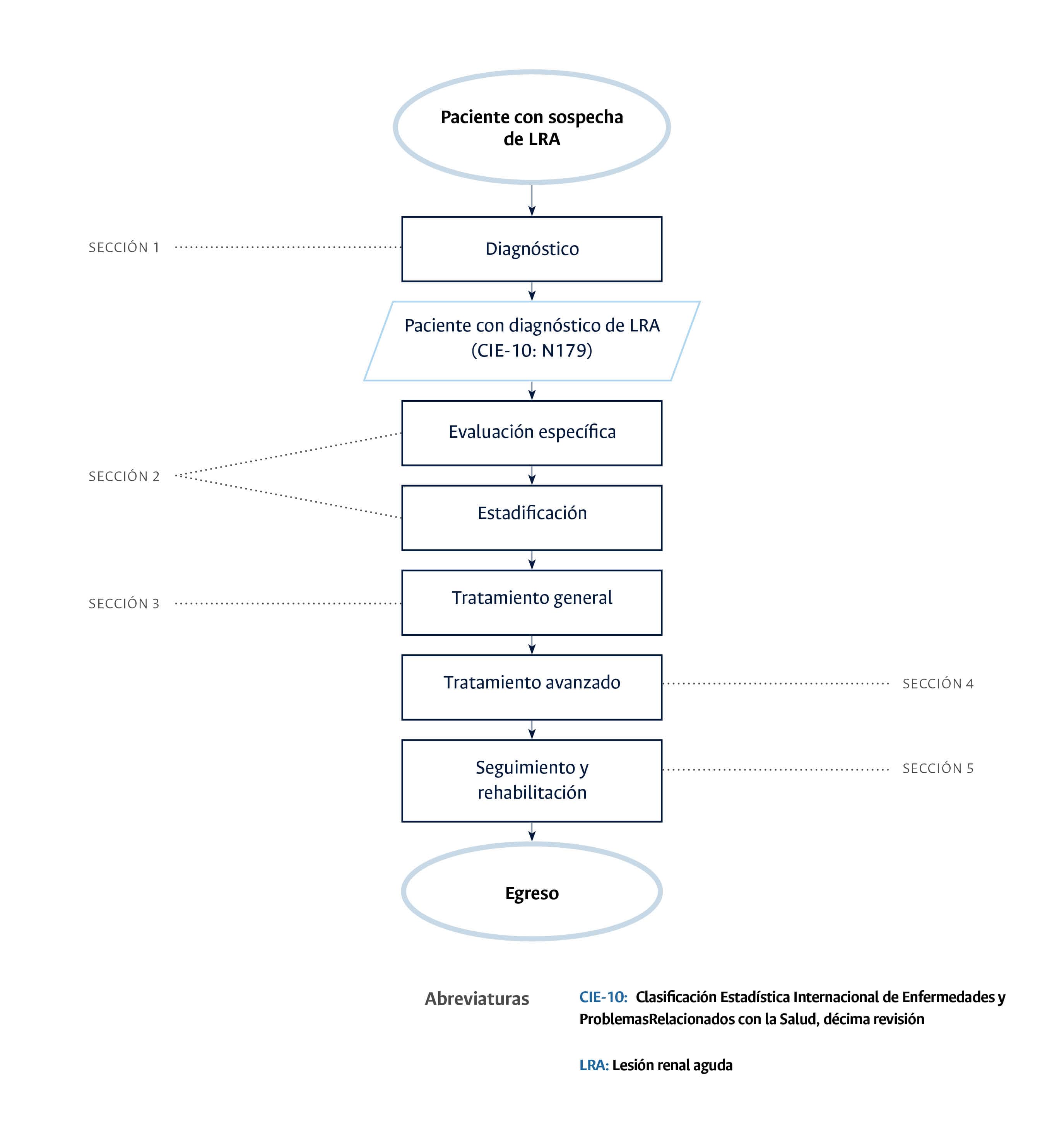 • Generar un consenso entre las diferentes áreas/servicios asistenciales involucrados con la prevención, el diagnóstico, estadificación, tratamiento, rehabilitación y seguimiento de pacientes adultos con LRA atendidos en consulta externa, hospitalización y unidad de cuidado crítico del HUN.
